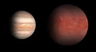 ![]() Comparación de tamaños entre WASP-4b y Júpiter. (La imagen de WASP-4b es una recreación artística totalmente ficticia). | ||