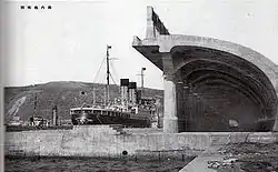 El transbordador Chihaku "Aniwamaru" de los Ferrocarriles Gubernamentales Japoneses, aterrizando en el muelle norte del puerto de Wakkanai. El ferry Chihaku había conectado Wakkanai, en Hokkaido, y Odomari, en Sajalín, hasta que dejó de funcionar en 1945.
