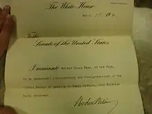 Walter Hines Page (Cary, 15 de agosto de 1855-Pinehurst, 21 de diciembre de 1918) fue un periodista, editor y diplomático estadounidense. Fue embajador de Estados Unidos en Gran Bretaña durante la Primera Guerra Mundial. Después de que estalló la Primera Guerra Mundial en 1914, Page se mostró tan entusiasta a favor de Gran Bretaña durante el período de neutralidad estadounidense (antes de abril de 1917) que Wilson y otros altos funcionarios descartaron cada vez más sus puntos de vista.[1] Page jugó un papel decisivo en la negociación de la venta de materiales de guerra estadounidenses, incluidas municiones, alimentos y suministros, a los británicos, ayudando a garantizar que tuviera los recursos que necesitaba para continuar la lucha contra Alemania.