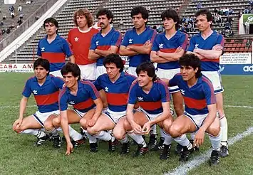 ![]() Tigre en 1987. Parados (de izquierda a derecha): Sergio Benet, Carlos López, Omar Montero, Raúl Celín, Omar Cerrillo y Edgardo Benedetti; agachados: César Carrizo, Walter Pajón, Jorge Godoy, Juan Corona y Walter Toloza. | ||