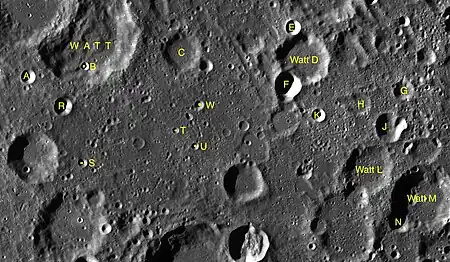 Por convención estos elementos son identificados en los mapas lunares poniendo la letra en el lado del punto medio del cráter que está más cercano a Watt.