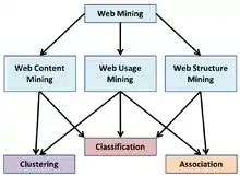 Web mining - es la aplicación de técnicas de minería de datos para descubrir los patrones de la Web. De acuerdo a los objetivos de análisis, la minería web se puede dividir en tres tipos diferentes, que son la minería de uso de la Web, minería del contenido de la Web y minería de la estructura de la Web.