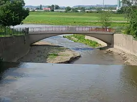 ![]() Desembocadura del Weißeritz en el Elba a la altura de Dresde. A veces, en inundaciones, el puente desaparece por completo bajo el agua | ||