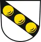 Escudo: „En plata, una banda diagonal negra con tres esferas doradas.“