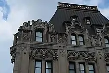 Los tres pisos superiores consisten en un techo abuhardillado revestido de cobre.[25] Hay mamparas abuhardilladas que tienen pequeños balcones en el piso 21, mientras que los pisos 22 y 23 tienen ventanas abuhardilladas. Estas ventanas están cubiertas por cubiertas poligonales de buhardilla.[34] Sobre el piso 23 hay una superficie de techo de asfalto que tiene equipos mecánicos y mamparas.[35] Las buhardillas, así como los tourelles decorativos, se sumaron a la estética del edificio cuando se vio originalmente desde el paseo marítimo.[18]
