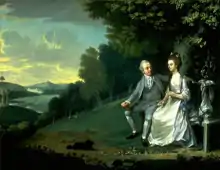 - En el fondo de la colina está la iglesia recién terminada, pero curiosamente el mausoleo construido hacia 1764 (por un miembro de la familia Bastard) está ausente, lo que sugiere que la atribución de la fecha a la pintura es incorrecta. Si la fecha de 1776 es correcta, es probable que la dama retratada no sea Lady Dashwood, quien murió en 1769, sino Frances Barry, la amante de Dashwood y madre de sus dos hijos, con quien vivió después de la muerte de su esposa.