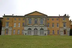 La fachada, que tiene similitudes con la fachada principal del palacio Chiericati de Palladio de 1550, fue originalmente el frente de entrada. La puerta de entrada todavía está en el centro de la planta baja y conduce al vestíbulo de entrada principal.[Na. 5] Esta es una desviación sustancial de la forma clásica del palladianismo inglés en el que la entrada principal y las habitaciones principales estarían en el primer piso al que se accede por una escalera exterior, lo que da a las salas de recepción principales vistas elevadas, con la planta baja dedicada a las habitaciones de servicio. Una reorganización tan radical no fue posible aquí, ya que la casa era una reconstrucción parcial en lugar de una estructura completamente nueva.[10]