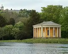 La arquitectura clásica continúa a lo largo del camino alrededor del lago, con el "Templo de Flora", una casa de verano escondida, y el "Templo de Daphne", ambos con reminiscencias de un pequeño templo en la Acrópolis. Otro templo escondido, el "Templo Redondo", tiene una logia curva. Más cerca de la casa, ocultando el ala de servicio, se encuentra un arco de triunfo romano, el "Templo de Apolo ", también conocido (debido a su antiguo uso como lugar para las peleas de gallos) como "Arco de la carlinga", que contiene una copia del el famoso Apolo de Belvedere. Muy cerca se encuentra el "Templo de Diana", con un pequeño nicho que contiene una estatua de la diosa. Otra diosa se celebra en el "Templo de Venus". Debajo hay una Exedra, una gruta (conocida como el Salón de Venus) y una estatua de Mercurio. Esta vez tuvo una copia de la Venus de Medici; fue demolido en la década de 1820 pero reconstruido en la década de 1980 y ahora tiene una réplica de la Venus de Milo.[Da. 11]