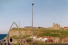 El acantilado de poniente exhibe dos esculturas emblemáticas: una es la estatua de James Cook, quien trabajó en su juventud para unos armadores de Whitby como aprendiz en uno de los mercantes de carbón que operaban en la costa de Inglaterra; y la otra es un arco formado con los huesos de la mandíbula de una ballena, para recordar el pasado de Whitby como parte de la industria ballenera. En la actualidad, el arco que se halla al aire libre en el acantilado es un segundo modelado. El original, mucho más grande, se conserva formando parte del fondo del Museo del Patrimonio Local (Heritage Centre).