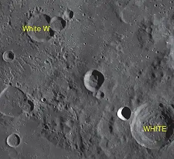 White es un cráter de impacto lunar. Se encuentra en la cara oculta de la Luna, al suroeste de la enorme llanura amurallada del cráter Apolo. Alrededor de un diámetro al sur-suroeste se halla el pequeño cráter Hendrix.