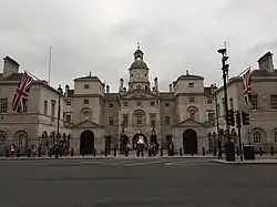 El edificio de los Horse Guards fue diseñado por William Kent y construido en la década de 1750 en un antiguo lugar de celebración de justas, sustituyendo a un edificio anterior construido durante la guerra civil inglesa. El edificio tiene un arco para el tráfico de carruajes y dos arcos peatonales que comunican Whitehall con Horse Guards Parade. El arco central está marcado con las siglas «SMF» y «StMW», y constituye el límite entre las parroquias de las iglesias de St Martin-in-the-Fields y St Margaret's.[18]