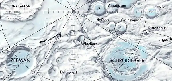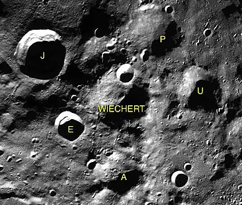 ![]() Localización de Wiechert, cerca del polo sur lunar (centro de la imagen) |