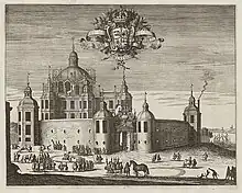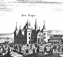 El centro de este palacio renacentista rectangular era la iglesia abovedada del palacio, con habitaciones circundantes conectadas por arcadas abiertas y logias . Los coros de la iglesia posiblemente tenían ojivas y rosetones como los del castillo de Vadstena. Los palacios construidos en esta época se caracterizaban por sus torres y pináculos con campanas adornadas, ventanales, arcadas y galerías, que probablemente también eran elementos destacados del palacio renacentista de Drottningholm.[3]