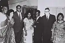 ![]() Recepción en la embajada de Israel en Acra, 6 de marzo de 1964, Día de la Independencia: De izquierda a derecha: William Marmon Quao Halm, James Mercer (diplomat), (he:מיכאל ארנון) Michael Arnon Garfunkel ( * 19 de abril de 1925 en Viena † octubre de 2004), Esposas[1] | ||