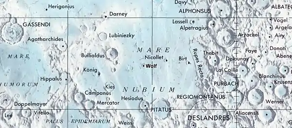 Por convención estos elementos son identificados en los mapas lunares poniendo la letra en el lado del punto medio del cráter que está más cerca de Wolf.
