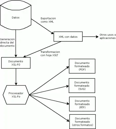 - Generarlo directamente a partir de los datos. El documento XSL-FO contiene las especificaciones de formato y los propios datos.