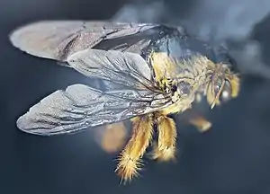 Los machos de muchas especies tienen un manchón blanco o amarillento en la cara que está ausente en las hembras. Además los machos suelen tener ojos más grandes, que tienen una función en su comportamiento sexual. En algunas especies el macho es de color claro, no negro; pueden ser amarillentos o cremosos. Los machos establecen y vigilan sus territorios, dispuestos a atacar a cualquier intruso. No son peligrosos porque al igual que los demás machos de Hymenoptera carecen de aguijón y no pueden picar.[5] Las hembras sí son capaces de picar pero raramente lo hacen y solo si se sienten amenazadas.