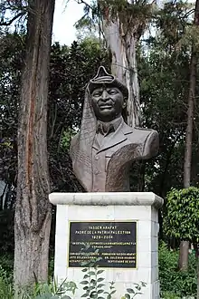 Mohamed Yasir Abdel Rahman Abdel Rauf Arafat al Qudwa al Huseini (en árabe: محمد ياسر عبد الرحمن عبد الرؤوف عرفات القدوة الحسيني) (El Cairo, Egipto,[1] 24 de agosto de 1929 - Clamart, Francia, 11 de noviembre de 2004), más conocido como Yasir Arafat (ياسر عرفات) o por su kunya Abu Ammar (أبو عمار), fue un político nacionalista palestino, presidente de la Organización para la Liberación de Palestina, presidente de la Autoridad Nacional Palestina y líder del partido político secular Fatah, que fundó en 1959.[2] Arafat pasó gran parte de su vida luchando contra Israel en nombre de la autodeterminación de los palestinos. Aunque se había opuesto a la existencia de Israel, en 1988 cambió de posición y aceptó la Resolución 242 del Consejo de Seguridad de Naciones Unidas.
