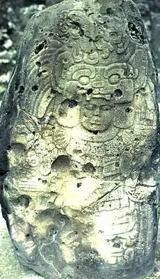 ![]() Estela 4 en Tikal, describiendo a Yax Nuun Ayiin I. Foto de 1980. | ||