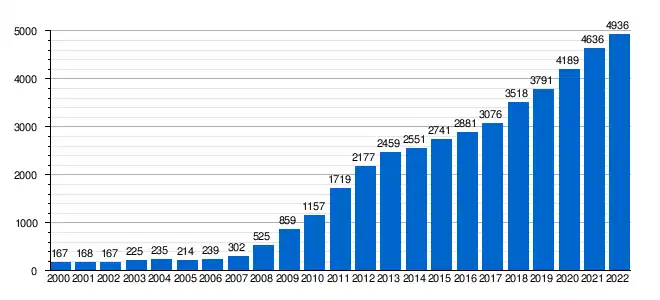 | Gráfica de evolución demográfica de Yebes[5] entre 2000 y 2022 |