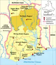 Se encuentra ubicada cerca de los ríos Volta Negro y Blanco, al norte de Acra —la capital del país— y del golfo de Guinea.