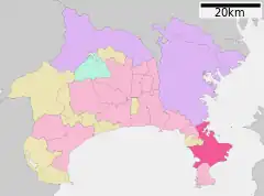 Está ubicada en la boca de la bahía de Tokio, concretamente en la península de Miura, que ocupa hasta la bahía de Sagami. Las poblaciones vecinas o colindantes son Yokohama, Miura, Hayama y Zushi.
