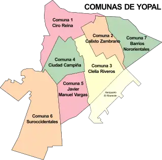 La Cabecera municipal de Yopal se encuentra dividida en siete comunas, las cuales comprenden 124 barrios. [9]