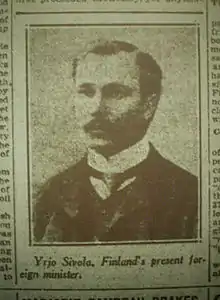 El 19 de enero de 1918, se desencadenó una batalla entre las Guardias Rojas y el Cuerpo de Protección conservador de Viipuri, en la que intervinieron tropas rusas para auxiliar a los primeros.[14] La lucha pronto se amplió con la captura de la Guardia Roja de Helsinki en la noche del 27/28 de enero.[15] Las fuerzas del movimiento Blanco encabezadas por Carl Gustaf Emil Mannerheim controlaban los cinco sextas partes septentrionales de Finlandia, mientras que los rojos controlaban el sur, que contenía aproximadamente la mitad de la población del país e incluía las ciudades de Pori, Turku, Tampere, Riihimäki, Helsinki, Kotka y Viipuri.[16] Se declaró una guerra civil, en la que Sirola sirvió como Comisario de Asuntos Exteriores.