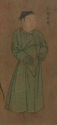 Yue Fei (chino: 岳飛; 24 de marzo de 1103-28 de enero de 1142),[1] nombre de cortesía Pengju (鵬舉), fue un general militar chino que vivió durante la dinastía Song del Sur. Es considerado un héroe nacional de China y es conocido por haber liderado las fuerzas de Song del Sur en las guerras del siglo XII entre la dinastía Song del Sur y la dinastía Jin, gobernada por los jurchen en el norte de China. Debido a su postura belicosa, fue condenado a muerte por el gobierno de Song del Sur en 1142 bajo una acusación inventada, después de que se alcanzara una paz negociada con los jurchen.[2] Yue Fei aparece representado en el Wu Shuang Pu (無雙譜, Tabla de héroes sin par) de Jin Guliang.