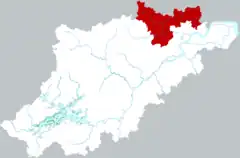- Poblados: Táng qī zhèn, píng yáo zhèn, bǎizhàng zhèn, huáng hú zhèn, lú niǎo zhèn y jìng shān zhèn.