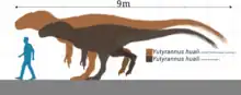 Yutyrannus huali es la única especie conocida del género extinto Yutyrannus ("tirano con plumas") de dinosaurio terópodo tiranosauroide, que vivió a mediados del período Cretácico, hace aproximadamente 125 millones de años durante el Aptiense, en lo que ahora es Asia.[1] Sus restos fósiles han aparecido en la provincia de Liaoning, China. Se han encontrado tres especímenes casi completos, el holotipo es ZCDM V5000 y los paratipos ZCDM V5001 y ELDM V1001.[1] Con sus cerca de 9 metros de longitud, Y. huali es el mayor dinosaurio con plumas conocido.[1]