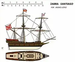 Una zabra era un barco de unas 200 tm, propulsado por velas, ideado para llevar mercancías por los océanos, como el Atlántico, y bien armado para defenderse de piratas o corsarios.