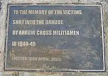 "La composición titulada 'Zapatos en la orilla del Danubio' recuerda a las 3.500 personas, 800 de ellas judías, que fueron fusiladas en el Danubio durante la época del terror de la Cruz Flechada.[2] El escultor creó sesenta pares de zapatos de hierro apropiados para la época. Los zapatos están sujetos al terraplén de piedra, y detrás de ellos hay un banco de piedra de 40 metros de largo y 70 cm de alto. En tres puntos hay carteles de hierro fundido con el siguiente texto en húngaro, inglés y hebreo: "A la memoria de las víctimas fusiladas en el Danubio por milicianos de la Cruz Flechada en 1944-45. fue erigido el 16 de abril de 2005"[3]
