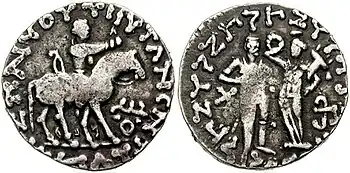 Sus monedas llevan el símbolo budista Triratna en el anverso, y adoptan representaciones de divinidades griegas como la diosa Tique.
