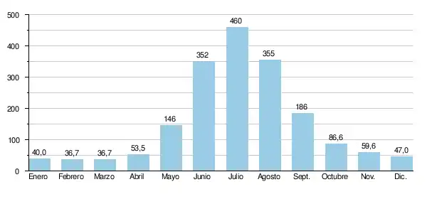 El caudal medio mensual observado en febrero-marzo (mínimo de estiaje) fue de 36,7 m³/s, o menos de la doceava parte del caudal medio en julio (460 m³/s), lo que refleja la amplitud relativamente grande de las variaciones estacionales. En el período de observación de 63 años, el flujo mínimo mensual fue de 26 m³/s (marzo), mientras que la tasa máxima mensual ascendió a 661 m³/s (julio).