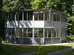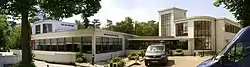 - Es un gran edificio combinación de cuatro volúmenes lineales en planta baja, con un gran volumen central en la planta alta que los cubre parcialmente. La combinación de grandes planos de cerramiento blancos con los acristalamientos y las losas en voladizo le convierten en un precedente de la arquitectura blanca de Richard Meier.[2]