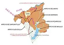 - Al Oeste: todo el río Alcollarín, el arroyo del Peral, el arroyo de la Gargantilla y el arroyo de Levosilla; y sobre todo la sierra de la Peña (en la zona noroeste) con el pico de la Peña de 799 m.