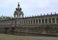 El edificio barroco Zwinger fue erigido entre 1711 y 1728 sobre los restos de un bastión entre la Semperoper y la Postplatz según los planos de Matthäus Daniel Pöppelmann y Balthasar Permoser.