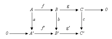 Considérese el siguiente diagrama conmutativo en cualquier categoría abeliana (como por ejemplo la categoría de los grupos abelianos o la categoría de los espacios vectoriales en un dado campo) o en una categoría de grupos.