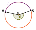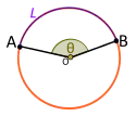 Sean L el arco menor de la circunferencia entre los puntos A y B; y R el radio de la circunferencia.[2]