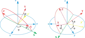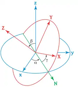 La intersección de los planos coordenados xy y XY escogidos se llama línea de nodos, y se usa para definir los tres ángulos: