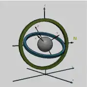 Soporte cardán mostrando ángulos de Euler. Los ejes del marco externo se muestran en la base. Los ejes Y son perpendiculares a cada anillo.