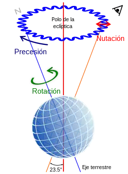 Rotaciones de Euler de la tierra. Rotación intrínseca en verde, Precesión en azul y Nutación en rojo.
