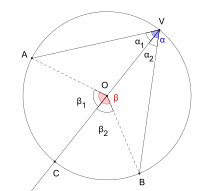 Supongamos que el centro de la circunferencia está dentro del ángulo . Por lo tanto el arco incluye el punto , ya que es el punto diamentralmente opuesto a . Los ángulos y también son ángulos inscritos, pero cada uno de estos ángulos tiene un lado que pasa por el centro y, por lo tanto, podemos aplicar la conclusión del apartado anterior a ambos.