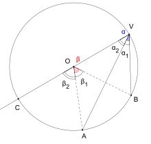 Sea el centro de una circunferencia. Además, consideremos y dos puntos en la circunferencia, y el otro extremo de la cuerda que pasa por y . es la amplitud del arco comprendido entre las secantes y , y su ángulo inscrito.