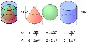 Las siguientes fórmulas se pueden usar para mostrar que el área de superficie de una esfera y un cilindro del mismo radio y altura están en la relación 2 : 3, como sigue.