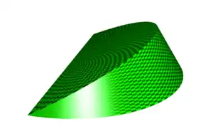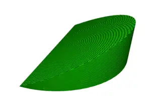Una úngula cónica de altura h, radio de la base r y pendiente de la superficie plana superior k (si la base semicircular está en la parte inferior, en el plano z = 0) tiene volumen