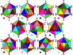 ![]() Los 11 hemicosaedros con vértices etiquetados por índices 0..9,t. Las caras están coloreadas por la celda a la que se conectan, definidas por los pequeños cuadros de colores | |