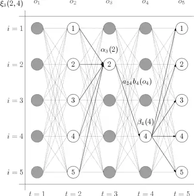 Para ello definimos previamente como la probabilidad de estar en el estado en el instante y en el estado en el instante , dado una observación y el modelo .