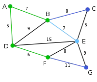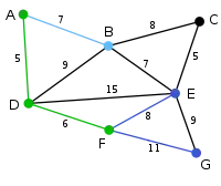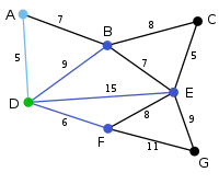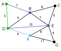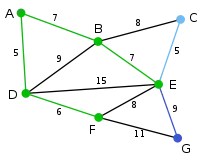 El algoritmo continua. El vértice B, que está a una distancia de 7 de A, es el siguiente marcado. En este punto la arista DB es marcada en rojo porque sus dos extremos ya están en el árbol y por lo tanto no podrá ser utilizado. | null | C, E, G | A, D, F, B |